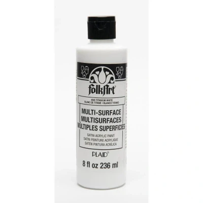 Titanium White With FolkArt Multi-Surface Acrylic paint, you can paint wood, glass, ceramic, metal, terra cotta, rigid plastic, canvas, styrofoam, slate, paper mache and fabric all with the same bottle! The patented, self-sealing formula offers superior coverage for fewer coats and quicker drying times. With a dishwasher-safe satin finish, this water-based non-toxic formula resists moisture as well as rust and comes in a wide color palette including basics and trend-right shades. PL2511 PE4645 PE4645 MPN 4645