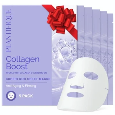 PLANTIFIQUE Facial Sheet Mask Collagen Boost 5 Pack Anti Aging & Firming Face Sheets with Collagen, Coenzyme Q10 Blueberries Korean Skincare for a Smooth, Revitalized Look
