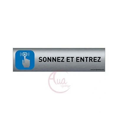 Plaque de porte aluminium brossé imprimé Dimensions 200 x 50 mm Double face adhésif au dos Impression UV directement sur l'aluminium (Pas contre collage) (Sonnez et entrez)