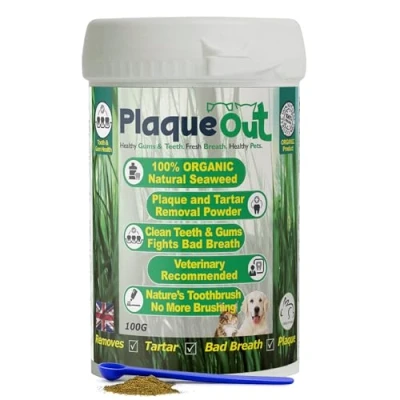 Natural Plaque Remover for Dogs & Cats: Plaque Out’s 100% natural seaweed for dogs teeth is an effective cat and dog plaque remover and dog breath freshener. Suitable for both Dogs and Cats, Plaque Out is a safe, chemical-free way to improve your pet’s oral hygiene and freshen their breath naturally. Plaque Out also contains vitamins, minerals, antioxidants and is rich in natural iodine to keep your pets healthy and happy and potentially save you from huge vets bills and pet dental care! How It Works - From the Inside Out: Once ingested, our vet-recommended plaque off powder for dogs and cats releases active enzymes through the saliva to soften and help remove plaque and tartar. It works systemically for complete oral hygiene, even in hard-to-reach areas that brushing can’t clean, for noticeably cleaner teeth and fresher dog breath from just 3 weeks of daily use. Promotes Long-Term Dental Health: 70% of cats and 85% of dogs over 3 years old show signs of poor dental hygiene and plaque buildup. This can have negative effects including pain, infections and, of course, tooth loss. Our cat and dog teeth cleaning powder helps to remove your pets’ current tartar and plaque buildup and prevent future tartar formation when used daily. Regular use supports overall oral hygiene, helping avoid costly vet treatments and keeping your pet’s teeth strong and healthy. Easy to Use Daily Supplement: Simply use the provided scoop to mix the recommended dose to food with no brushing required! Use ½-1 scoop for small dogs or cats, 1-2 scoops for medium dogs, and 2-3 scoops for large breeds once per day. Our ultra-fine dental powder for dog's teeth and cat’s teeth is both gluten-free and grain-free. It works great with dry or wet food, making daily cat and dog teeth cleaning effortless and stress-free for both pets and owners. A Trusted UK Brand That You Can Rely On: We are a proud family business based in the UK with a passion for keeping your pets healthy. We are DEFRA-registered with years of experience in manufacturing natural, cruelty-free pet supplements and all of our products, including Plaque Out, are made to the highest standards to ensure purity, consistency, and safety for your beloved pets.