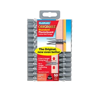 General description Plasplugs Originals Plasterboard Fixings are reliable, easy-to-use fasteners designed for general applications in plasterboard. They are suitable for securing lightweight items such as curtain tie-backs, wall hooks, smoke alarms, and switches. Technical specifications Drill size: 6mm Screw size: No.8 (4.5mm) Pack quantity: 50 fixings Compatibility and accessories Designed specifically for plasterboard surfaces. Installation Drill a 6mm hole in the plasterboard Insert the fixing into the hole Secure with a No.8 screw (4.5mm) Usage Ideal for fixing lightweight objects such as curtain tie-backs, wall hooks, and smoke alarms to plasterboard walls.