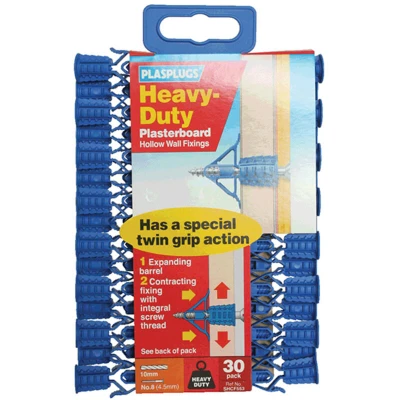 General description Plasplugs' original heavy-duty plasterboard fixings are designed for securing medium to heavyweight items in plasterboard. These fixings utilize multi-thread technology for superior holding power and feature an expanding barrel with a contracting fixing and integral screw thread for secure attachment. Typical applications include shelving units, wooden battens, wall lights, and small mirrors. Technical specifications Size: 4.5mm Type: Plasterboard plug Drill size required: 10mm Screw size: No 8 (4.5mm) Pack of 30 Compatibility and accessories Compatible with standard No 8 screws Compatible with 10mm drill bits Installation Drill a 10mm hole into the plasterboard at the desired location. Insert the fixing into the hole until flush with the surface. Screw in a No 8 screw to secure the item firmly. Usage Ideal for mounting shelves, wall lights, small mirrors, and wooden battens on plasterboard walls. Ensure the fixing is fully expanded and secured before hanging heavy