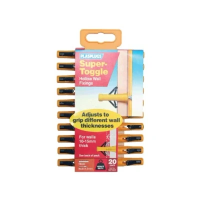 General description Plasplugs® Super Toggle Fixings are designed for secure wall mounting, featuring expanding wings that spread the load over a wide area. They are ideal for overhead applications and can be used on various wall types, including plaster, lathe, and plasterboard. Typical applications include mounting wall clocks, shelving units, wall cabinets, and bathroom fixtures. The fixings adjust to grip wall thicknesses from 10 to 15mm, providing a versatile solution for different installation needs. Technical specifications Screw Size: No.8 (4.5mm) Drill Size: 10mm Pack Quantity: 20 fixings Type: Spring Toggle Compatibility and accessories Compatible with No.8 (4.5mm) screws Suitable for use with various wall materials such as plaster, lathe, and plasterboard Installation Drill a 10mm hole in the wall at the desired location Insert the toggle fixing into the hole Secure with a No.8 screw, allowing the wings to expand and grip the wall securely Usage Ideal for mounting shelves,