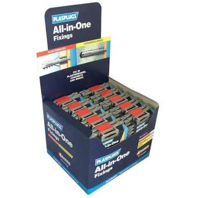 General description The Plasplug MFA520 bargain bin is a counter display featuring 20 assorted packs of MFA500 All-in-One fixings. Each pack contains a variety of plugs suitable for use in plasterboard, solid walls, and concrete. Technical specifications Contains: 20 assorted packs of 52 plugs Sizes included: 8 x 5mm, 20 x 6.5mm, 16 x 8mm, and 8 x 10mm Usage Designed for use in plasterboard, solid walls, and concrete Features an expanding barrel, barbed jaws, and anti-rotate ribs for a secure fix Other information Supplied with a handy screw and drill gauge