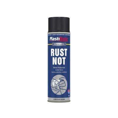 General description The PlastiKote Rust Not Spray Gloss Black is specially formulated for maximum rust protection, providing a hard-wearing and durable finish. This spray paint penetrates the metal's surface to form a permanent bond that is impact resistant, ensuring it will not peel, flake, or fade for years. Technical specifications Finish: Gloss Colour: Black Pack Size: 500ml Drying time: Touch dry in 10 - 20 minutes, thoroughly dry in 30 - 40 minutes Coverage: Approx. 2.6m² per can