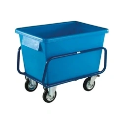 Mobile container truck. High density polyethylene (HDPE) construction. Remove container from wheels for easier storage. Fitted with 2 fixed and 2 swivel castors (200mm diameter). Maximum capacity: 250kg. Dimensions: 1040x700x860mm (WxDxH). Colour: Blue.