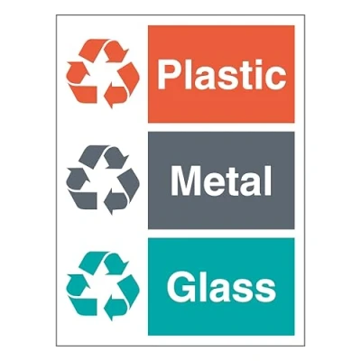 Identifies the Plastic / Metal / Glass stream at a glance—ideal for bottles, cans, trays and jars to keep non-recyclables out. Supports the UK Simpler Recycling rollout with consistent bin-side cues that cut contamination and improve collection quality across sites. Designed for high-traffic areas (kitchens, break rooms, workshops) with clear iconography and wording to speed correct sorting. High-visibility artwork with durable, UV-stabilised print for long-lasting legibility indoors or out; available in multiple sizes and materials. 3mm Aluminium Composite – Tough, rustproof, and ideal for long-term indoor and outdoor use.