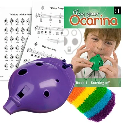 Ocarina, Purple 4-hole Oc, with Play your Ocarina Book 1 and OcSock from Ocarina Workshop The English Ocarina is the perfect musical instrument for any first-time musician from four years to adult. Play a full chromatic octave (D to D') on the 4-hole Oc with a clear sound and no squeaks. All holes are within easy reach of even the smallest fingers and easy to locate for larger ones. This is a robust ocarina, tuned to concert pitch. Play your Ocarina Book 1 has 22 well-known tunes with ocarina fingercharts and musical notation, guitar chords and words to songs. Even the musical beginner will be playing proper tunes in minutes. Let your fingers be guided by easy-to-follow picture music. Book 1 allows seamless, page by page, progression without having to read a note of music. Clear, straightforward teaching notes and tips throughout. Well suited to musical beginners of any age. The included soft and stretchy OcSock fits your Oc perfectly to keep it safe whilst around your neck or when not in use.