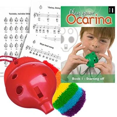 Ocarina, Red 4-hole Oc, with Play your Ocarina Book 1 and OcSock from Ocarina Workshop The English Ocarina is the perfect musical instrument for any first-time musician from four years to adult. Play a full chromatic octave (D to D') on the 4-hole Oc with a clear sound and no squeaks. All holes are within easy reach of even the smallest fingers and easy to locate for larger ones. This is a robust ocarina, tuned to concert pitch. Play your Ocarina Book 1 has 22 well-known tunes with ocarina fingercharts and musical notation, guitar chords and words to songs. Even the musical beginner will be playing proper tunes in minutes. Let your fingers be guided by easy-to-follow picture music. Book 1 allows seamless, page by page, progression without having to read a note of music. Clear, straightforward teaching notes and tips throughout. Well suited to musical beginners of any age. The included soft and stretchy OcSock fits your Oc perfectly to keep it safe whilst around your neck or when not in use.