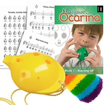 Ocarina, Yellow 4-hole Oc, with Play your Ocarina Book 1 and OcSock from Ocarina Workshop The English Ocarina is the perfect musical instrument for any first-time musician from four years to adult. Play a full chromatic octave (D to D') on the 4-hole Oc with a clear sound and no squeaks. All holes are within easy reach of even the smallest fingers and easy to locate for larger ones. This is a robust ocarina, tuned to concert pitch. Play your Ocarina Book 1 has 22 well-known tunes with ocarina fingercharts and musical notation, guitar chords and words to songs. Even the musical beginner will be playing proper tunes in minutes. Let your fingers be guided by easy-to-follow picture music. Book 1 allows seamless, page by page, progression without having to read a note of music. Clear, straightforward teaching notes and tips throughout. Well suited to musical beginners of any age. The included soft and stretchy OcSock fits your Oc perfectly to keep it safe whilst around your neck or when not in use.