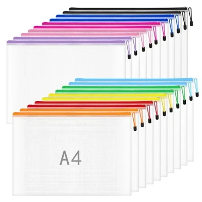 Size: The plastic zip wallets are in A4 size. A4 Zip wallets is about 34 x 24CM/13.39 x 9.45inch. A4 paper can be easily put into the bag. Material: Large ziplock bags made of PVC, durable and water resistant. A4 plastic folders is very strong and not easy to break. Design: Plastic Folders A4 has very good quality zipper and rope hook, easy to open and carry. Woven style mesh is thicker than normal plastic wallets A4. Applications: Zip wallets A4 is perfect for filing, storage and presentation. Such as family letters and receipts, small travel objects and office supplies. Package List: 20 pieces in total, A4 zip folders in 10 colors, 2pcs for each colour.