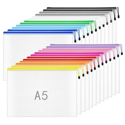 Material: A5 plastic wallet made of eco-friendly PVC material, durable and waterproof. Plastic folder can last for a long time, not easy to break. Size: The zip lock bags are in A5 size, each measures about 23.5CM*17CM/9.2*6.6inch. Easily fits most A5 documents and business files. Wide Applications: A5 wallet is suitable for storing files or other small objects, such as A5 papers, receipt, Puzzle piece, cosmetics, passbook, pocket money, pencils and rubbers ect. Design: Zip bags for storage is semi-transparent with Smooth and durable zipper. Rope hook design, easy to open and carry. A5 zip wallet can help you to find out the documents easily. Package list: 24 pieces plastic wallet folders, in 12 different colors, each color for 2 pieces. Enough for your daily office study and storage use.