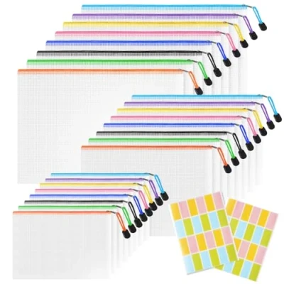 Packaging content: The zip bags includes 24pcs of zipper mesh bags in 3 sizes, 8 * A3 (44 cm x 31.5 cm), 8 * A4 (34 x 24 cm), 8 * A5 (24 x 17.5 cm). This zip wallets comes with 2 large sheets of label stickers. Each sheet contains 24 small stickers, making it incredibly convenient to distinguish items. These mesh zip wallets can meet your different needs and help you better classify your items Excellent Material: The zipper bag is made from high-quality PVC material. Zipped wallets is soft and bendable. Zip folders is waterproof and reusable, not easy to tear or wear. There are precise stitching at the edge of zip bag to protect files from falling off Vibrant Colours: Plastic zip Lock Bags is available in 8 distinct colours. The different Colours of zip file bag help you categorise and organise files efficiently. The semi-transparent design ensures privacy for important documents while allowing quick visibility of contents Enhanced Zipper: Durable metal zippers glide smoothly without jamming, let you easy to open and close the document wallets. Each mesh bag features with a pull cord offers convenient for carrying or wall-hanging to save space Versatile Use: These multi-size mesh zipper bag meet all your storage needs. Perfect for classrooms, offices, and travel – organising documents, stationery, cash, card, receipts, passports, letters, keys, picture, board games, puzzle pieces, cross-stitch projects, cosmetics, and more