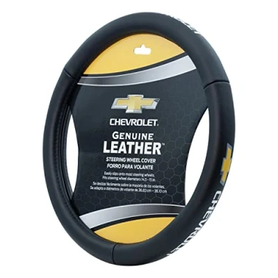 Chevrolet Genuine Leather steering wheel cover is built for standard size steering wheels that measure from 14.5”-15.0” inches across Chevrolet Official Licensed Product. Designed, manufactured and distributed by Plasticolor Inc. Slip-on design makes for easy installation High Quality Embossed Logo for durability and style Bowtie Logo and Chevrolet Script repeated 3 times around Steering Wheel Cover