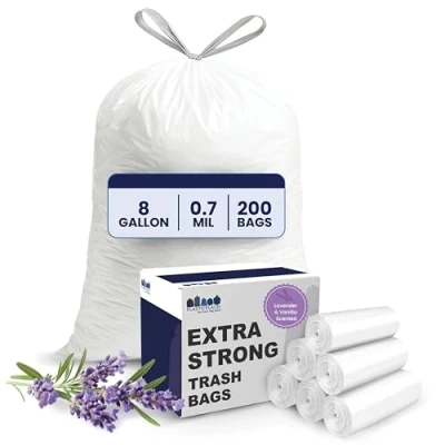 LAVENDER AND SOFT VANILLA SCENTED - Keep your kitchen free of odors and smelling fresh with these lavender and soft vanilla scented trash bags. Mask the odor of ordinary kitchen trash, baby diapers, and food scraps with this pleasant-smelling fragrance that lines each bag. MULTI USE - Great for small trash cans in a bathroom, office, living room, bedroom and kitchen. Use in the car to keep all your wrappers and on-the-go trash securely contained. 8 GALLON DRAWSTRING BAGS - The drawstring handles make it a breeze to pull the bag out while keeping the mess inside. White 22”W x 22”H - 0.7 Mil Thick. NO TEARS or LEAKS - Trash bag liner is durable and designed to hold tough garbage with absolutely no tears or leaks. QUALITY STRENGTH - The included 200 scented bags on rolls, are made from low-density resins (thicker material).
