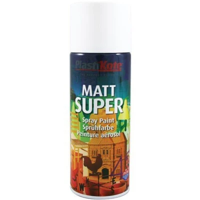 General description This versatile PlastiKote Super Spray Matt White RAL 9016 is an excellent multipurpose spray paint suitable for various surfaces both indoors and outdoors. It provides a durable, scratch-resistant, and fast-drying finish that protects against rust and UV damage, maintaining its color without fading or yellowing over time. Technical specifications Finish: Matt Color: White (RAL 9016) Size: 400ml Coverage: Approximately 2.23m² per can Drying time: Touch dry within 30-50 minutes; recoat within 1 hour Compatibility and accessories Suitable for: aluminium, fibreglass, glass, iron, masonry, metal, paper, papier-mâché, plastic, steel, stone, terracotta, wicker, and wood Not recommended for: high impact styrene, leather, Styrofoam, and vinyl Installation Shake the can well before use Apply in a well-ventilated area, holding the can at an appropriate distance for even coverage Multiple thin coats are preferable for best results Usage Ensure the surface is clean, dry, and