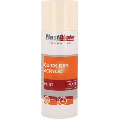 General description This PlastiKote Trade Quick Dry Acrylic Spray Paint offers a high-quality, quick-drying solution suitable for various DIY and home improvement projects. With a durable matte Magnolia finish, it is perfect for updating furniture, fixtures, or decorative objects. Technical specifications Finish/Color: Matte Magnolia Size: 400ml Coverage: approximately 1 to 1.75 square meters Type: Acrylic spray paint Compatibility and accessories Suitable for use on various surfaces such as wood, metal, plastic, and more Compatible with standard spray nozzles and spray guns Installation Shake the can well before use Hold the can upright at a distance of about 20-30 cm from the surface Apply in even, sweeping motions to avoid drips and uneven coverage Allow each coat to dry for a few minutes before applying additional coats Usage Ideal for painting furniture, fixtures, decorative objects, and DIY projects Ensure the surface is clean, dry, and free of dust or grease before painting Use