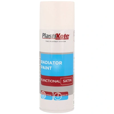 General description This PlastiKote Trade Radiator Spray Paint is designed for a smooth satin white finish, ideal for refreshing and protecting your radiators. Technical specifications Finish/Colour: Satin White Size: 400ml Coverage: 1-1.75m² Touch Dry: 10 minutes