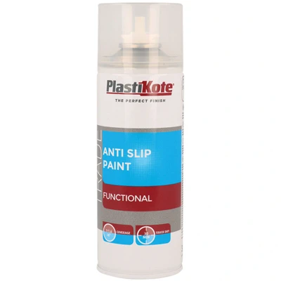 General description PlastiKote Trade Anti-Slip Spray Paint is a specially modified, fast-drying acrylic resin lacquer that features anti-slip particles and a transparent matte finish. It enhances grip on slippery surfaces, significantly reducing the risk of falls, even in wet conditions. This product is suitable for both interior and exterior applications, making it ideal for stairs, shower trays, bathroom floors, poolside tiles, tool handles, and more. It is resistant to chlorine and saltwater, ensuring durability in various environments. Technical specifications Size: 400ml Coverage: approximately 1 to 1.6 square meters Touch Dry Time: about 10 minutes Color: Clear Type: Anti-Slip Compatibility and accessories Suitable for concrete, tiles, wood, metal, linoleum, and most plastics Installation Shake the spray can well before use Apply in a well-ventilated area, maintaining an even distance from the surface Spray in multiple thin coats for best results, allowing each coat to dry for a