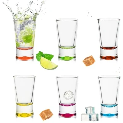 Details: W x H: 4 cm x 7 cm. Diameter: 4cm. Volume: 25 ml. Weight: 66 g. Colour: pink, red, orange, yellow, green, blue. Material: sturdy pressed glass. Use: The bar glasses are ideal for liqueurs, schnapps, tequila, vodka, ouzo, ramazotti, or grain. The cups are dishwasher safe but not suitable for use in the microwave. The shot cups are also suitable as gifts. Features: No more confusing beverage glasses, each guest has their own colour. The glass goblets with coloured base ensure the right mood and the solid base ensures good stability. Our glassware is made in the EU. Appearance: Each shot glass has a different interesting base colour. The stamps do not have a fill line. - - -, Weight: 0.87303055752 Pounds, Manufacturer: Platinux