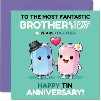 Celebrates 10 wonderful years with a pair of adorable cartoon cans, making their milestone feel extra special and light-hearted. Anniversary card for Brother & Sister In Law with a light-hearted design style Features a vibrant and playful design in blue. pink and green. with cheerful cans holding hands for a fun twist on the traditional tin anniversary Printed on quality gloss board with an uncoated inside, so there's no smudging when writing inside. Eco-conscious and recyclable too. Printed on 360 micron stock for a confident, premium feel Inside message: Brother & Sister In Law. Comes with a matching envelope for a lovely finishing touch. The 145mm Square format is convenient to display or post Created and printed in the UK using FSC-certified, giving you a feel-good choice that's as thoughtful as it is charming. A thoughtful choice that helps you send smiles and warm wishes