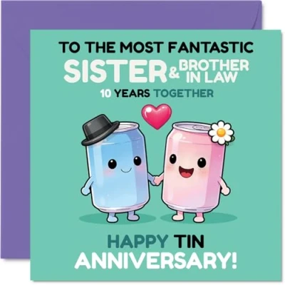 Brings a playful smile with two cheerful cartoon cans, perfectly capturing a decade of togetherness for this special milestone. Anniversary card for Sister & Brother In Law with a light-hearted design style Fun and colourful design in blue, pink, and green pops with personality-ideal for couples who appreciate a bit of light-hearted charm. Recyclable and printed in UK for a considerate choice Crafted using gloss single sided board with an uncoated inside-no smudging when writing inside, so your words stay crisp. Printed on 360 micron stock for a confident, premium feel Inside message: Sister & Brother In Law. Comes complete with a matching envelope for a polished presentation. The 145mm Square format is convenient to display or post Created with care in the UK using FSC-certified, recyclable materials for a card that feels as good as it looks. Printed in the UK. A thoughtful choice that helps you send smiles and warm wishes