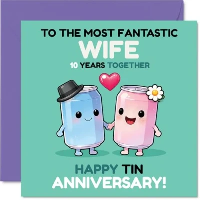 Playfully marks 10 years together with two happy cartoon tins, adding a cheeky touch to your anniversary moment. Anniversary card for Wife with a light-hearted design style Features a whimsical design in blue, pink, and green, with cute characters to make your tin anniversary memorable. Recyclable and printed in UK for a considerate choice Printed on gloss single sided board with an uncoated inside for easy writing. No smudging when writing inside. Printed on 360 micron stock for a confident, premium feel Inside message: Wife. Includes a matching envelope to complete the thoughtful gesture. The 145mm Square format is convenient to display or post Proudly made in the UK using FSC-certified, recyclable - crafted for quality and a smile every time. Printed in the UK. A thoughtful choice that helps you send smiles and warm wishes