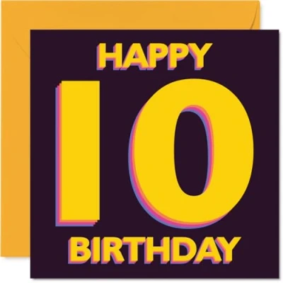 A vibrant card radiating excitement, with HAPPY 10 BIRTHDAY in big. bold lettering to make any ten-year-old feel extra special on their big day Stand-out celebration: dynamic number design in cheerful yellow and purple, creating a fun and festive look that pops on the mantelpiece. Recyclable; printed in UK for a considerate choice Printed on quality gloss single sided board, with an uncoated inside for easy, smudge-free writing. Made using FSC certified, recyclable materials Blank inside, so you've got plenty of space to pen your own personal message. Comes complete with a matching envelope for easy gifting. The 145mm Square format is convenient to display or post Designed and printed in the UK with care-ideal for anyone wanting to mark a milestone birthday with something cheerful and memorable. Ideal for a mum or dad celebrating a milestone birthday