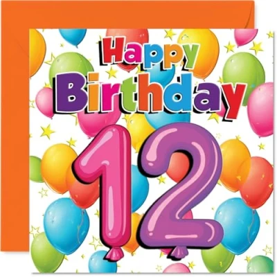 Playful 12th Birthday Card Bursting with Cheer Colourful Balloons and Stars Design Guaranteed to Brighten Their Big Day 145mm Square, Envelope Included