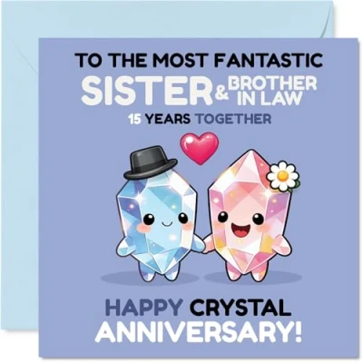 Bursts with fun and affection thanks to two adorable crystal characters gleefully marking 15 fabulous years together. Anniversary card for Sister & Brother In Law with a light-hearted design style Eye-catching blue, pink and white motif, with cheerful illustrations that bring a sense of celebration to this special anniversary. Recyclable and printed in UK for a considerate choice Crafted from gloss single sided board with an uncoated interior, making it easy to pen your personal message. No smudging when writing inside Inside message: Sister & Brother In Law. Includes a matching envelope to help you send your wishes in style. The 145mm Square format is convenient to display or post Printed in the UK on FSC-certified and fully recyclable, so you can feel good about sending a card that cares. A thoughtful choice that helps you send smiles and warm wishes