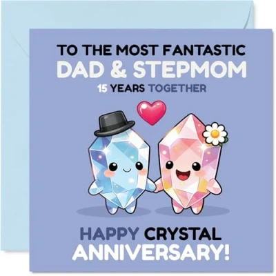 A playful design that captures the joy of 15 years together, featuring two happy crystal characters full of personality. Anniversary card for Stepmum & Dad with a light-hearted design style The motif combines vivid blue and pink crystals with a touch of fun, setting this card apart from the usual anniversary choices. Recyclable and printed in UK for a considerate choice Printed on quality gloss single sided board, with an uncoated inside. No smudging when writing inside - your words stay crisp. Printed on 360 micron stock for a confident, premium feel Inside message: Stepmum & Dad. Comes complete with an envelope for effortless gifting. The 145mm Square format is convenient to display or post Designed with care and printed in the UK using FSC-certified, recyclable - a cheerful keepsake you can feel good about. A thoughtful choice that helps you send smiles and warm wishes