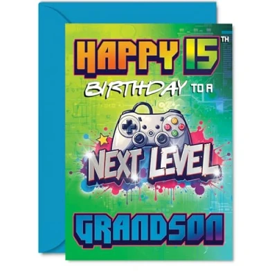 Brings a burst of gaming energy with its lively controller graphic, making any gamer's 15th birthday that much more epic. Birthday card for Grandson with a light-hearted design style Packed with vibrant greens, blues, purples and reds, this bold gaming motif suits teen gamers and fans of all things tech. Recyclable and printed in UK for a considerate choice Crafted from glossy board with an uncoated inside-no smudging when writing inside-so your message stays sharp. Printed on 360 micron stock for a confident, premium feel Inside message: Have An Epic Day. Comes complete with an envelope for easy gifting. The 5x7 Inch format is convenient to display or post. Envelope included Printed in the UK on FSC-certified and fully recyclable, offering standout quality with a feel-good eco touch. A thoughtful choice that helps you send smiles and warm wishes