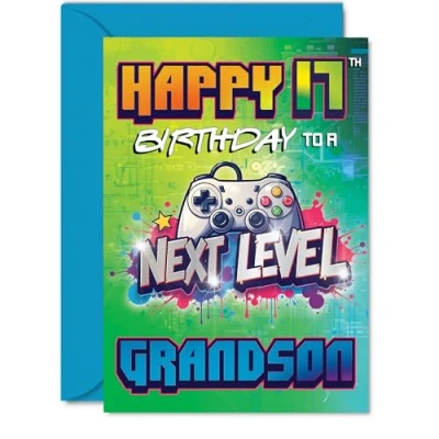 Playful 17th Birthday Card for Grandson Level Up the Fun Vibrant Gaming Controller Design with Bold Colours 5x7 Inch, Envelope Included