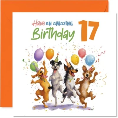 Playful 17th Birthday Card Let the Good Times Roll Four Dogs Partying with Balloons and Confetti Perfect for a Cheerful Bash 145mm Square, Envelope Included
