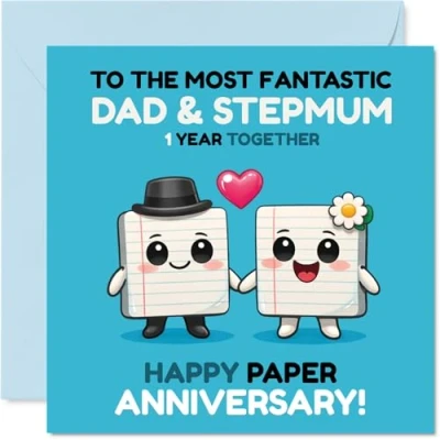 Celebrates their first year together with a playful vibe and charming cartoon dad and stepmum, sure to raise a smile. Anniversary card for Stepmum & Dad with a light-hearted design style Features cheerful blue and pink design with love-filled, cute characters, keeping things light-hearted and fun. Recyclable and printed in UK for a considerate choice Crafted from quality gloss board with an uncoated inside for easy writing - no smudging when writing inside. Printed on 360 micron stock for a confident, premium feel Inside message: Stepmum & Dad. Includes a matching envelope to make gifting easy and thoughtful. The 145mm Square format is convenient to display or post Printed in the UK on FSC-certified, recyclable for peace of mind - designed to make their special day memorable. A thoughtful choice that helps you send smiles and warm wishes