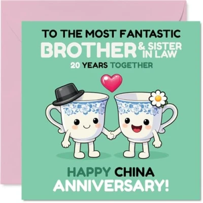 Brings a grin with its cheerful pair of cups holding hands, marking 20 years together in a light-hearted, playful way. Anniversary card for Brother & Sister In Law with a light-hearted design style Standout design features adorable cartoon cups in bright green, pink and blue, set against a clean white background for a fun look. Recyclable and printed in UK for a considerate choice Printed on glossy single sided board with an uncoated inside. No smudging when writing inside - just add your own message with ease. Printed on 360 micron stock for a confident, premium feel Inside message: Brother & Sister In Law. Includes a matching envelope for that finishing touch. The 145mm Square format is convenient to display or post Made with FSC certified and fully recyclable, crafted right here in the UK for quality you can trust. Printed in the UK. A thoughtful choice that helps you send smiles and warm wishes