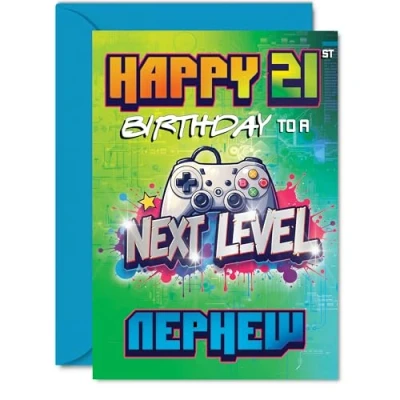 Celebrates a milestone with bags of personality, thanks to its bright colours and that iconic gaming controller front and centre. Birthday card for Nephew with a light-hearted design style A striking, energetic design blends green, blue and purple hues with bold text and a playful 'next level' gaming twist. Recyclable and printed in UK for a considerate choice Printed on quality gloss single sided board with an uncoated inside. No smudging when writing inside. Made with FSC board for eco peace of mind Inside message: Have An Epic Day. Comes complete with an envelope for easy gifting. The A5 format is convenient to display or post. Envelope included Made in the UK with recyclable materials-crafted to make their 21st feel even more legendary. Printed in the UK. A thoughtful choice that helps you send smiles and warm wishes
