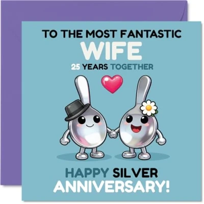 Sure to spark a smile, the playful cartoon spoons holding hands bring the joy of a long-lasting partnership to life. Anniversary card for Wife with a light-hearted design style Features a charming couple motif in soft blue, silver, and pink, creating a light-hearted feel that stands out from the usual. Recyclable and printed in UK for a considerate choice Printed on quality gloss board with an uncoated inside-no smudging when writing inside. Eco-friendly and responsibly sourced materials. Printed on 360 micron stock for a confident, premium feel Inside message: Wife. Supplied with a matching envelope so you're all set to make her day special. The 145mm Square format is convenient to display or post Designed and printed in the UK, this card brings extra cheer to any silver celebration. Enjoy a thoughtfully made keepsake. A thoughtful choice that helps you send smiles and warm wishes