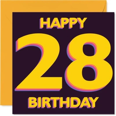 Playful 28th Birthday Card Bursting with Colour Bold Yellow and Purple Typography Design Perfect for a Lively Celebration 145mm Square, Envelope Included
