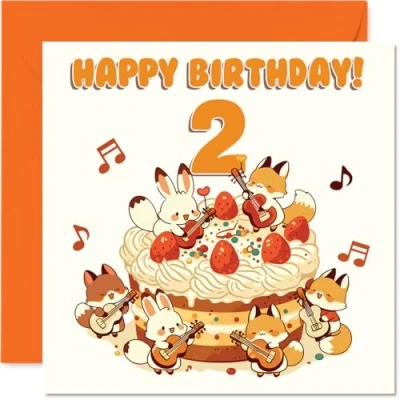 Playful 2nd Birthday Card Musical Animals Bring the Party Festive Cake Scene with Cheerful Orange Tones Guaranteed to Make Little Ones Smile 145mm Square, Envelope Included