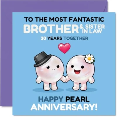 Radiates playful affection with two smiley pearl characters holding a heart, sure to bring a warm grin to the happy couple. Anniversary card for Brother & Sister In Law with a light-hearted design style Features a unique pearl anniversary design in vibrant blue, pink and white, standing out from ordinary cards for a truly memorable touch. Recyclable and printed in UK for a considerate choice Printed on quality gloss single sided board with an uncoated inside, so you won't get smudging when writing your own message. Printed on 360 micron stock for a confident, premium feel Inside message: Brother & Sister In Law. Supplied with a matching envelope for a complete gift-ready finish. The 145mm Square format is convenient to display or post Designed and printed in the UK using FSC-certified and recyclable materials, so you can feel good about your choice. A thoughtful choice that helps you send smiles and warm wishes