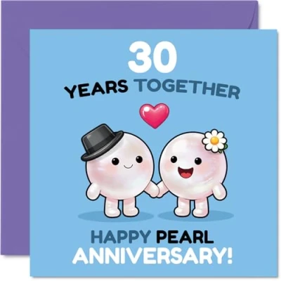 Playful and affectionate, this card features two adorable pearl characters holding hands - perfect for celebrating a special bond after 30 years together The delightful design uses soft blue, pink and white hues, with a lighthearted '30 YEARS TOGETHER' and 'HAPPY PEARL ANNIVERSARY!' message on the front Printed on gloss single sided board with an uncoated inside - no smudging when writing inside. Crafted from FSC certified, fully recyclable board and made in the UK so you can add your own thoughtful words. Comes with an envelope to make gifting easy. The 145mm Square format is convenient to display or post Designed to bring joy for a milestone occasion - ideal for marking a pearl anniversary in style and sharing a smile with your favourite couple