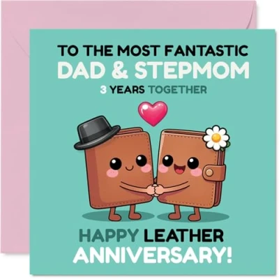 Full of playful spirit, this card features two adorable cartoon wallets holding hands, making it a fun way to mark three years together. Anniversary card for Stepmum & Dad with a light-hearted design style Stand-out motif with teal, brown, pink and white hues creates a lively, modern look - perfect for couples who love a bit of cheeky charm. Recyclable and printed in UK for a considerate choice Printed on glossy FSC-certified board with an uncoated inside for easy writing. No smudging when writing inside. Printed on 360 micron stock for a confident, premium feel Includes a coordinating envelope for a neat finish. Inside message: Stepmum & Dad. The 145mm Square format is convenient to display or post. Envelope included Designed and printed in the UK, this playful card adds a unique touch to any special anniversary moment. A thoughtful choice that helps you send smiles and warm wishes
