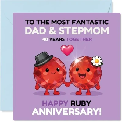 Brimming with joy, this playful card features two happy ruby characters raising a smile for a truly memorable 40th anniversary. Anniversary card for Stepmum & Dad with a light-hearted design style Distinctive and colourful, the bold purple and red design captures the fun-loving spirit of a lasting relationship. Recyclable and printed in UK for a considerate choice Crafted from quality gloss board with an uncoated inside for easy writing-no smudging when writing inside. Printed on 360 micron stock for a confident, premium feel Inside message: Stepmum & Dad. Includes matching envelope for that perfect finishing touch. The 145mm Square format is convenient to display or post Proudly made in the UK using recyclable materials and FSC-certified, so it feels good in hand and for the planet. Printed in the UK. A thoughtful choice that helps you send smiles and warm wishes