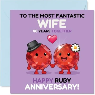 Brings a smile with its adorable ruby characters, hand in hand and full of affection-captures the joy of four decades together. Anniversary card for Wife with a light-hearted design style Features a charming motif of two playful rubies, set against a lively mix of purple and red with uplifting anniversary wishes. Recyclable and printed in UK for a considerate choice Printed on quality gloss board with an uncoated inside-no smudging when writing inside. Responsibly made using FSC-certified materials. Printed on 360 micron stock for a confident, premium feel Inside message: Wife. Includes a matching envelope for a thoughtful finishing touch. The 145mm Square format is convenient to display or post Proudly designed and printed in the UK using recyclable -crafted to help you celebrate this special milestone in style. A thoughtful choice that helps you send smiles and warm wishes