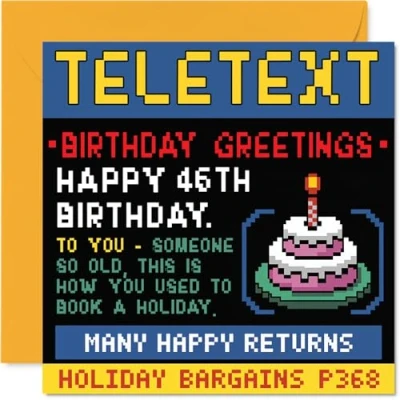A playful celebration brought to life with a lively retro cake taking centre stage, guaranteed to raise a smile on their big day. Birthday card with a light-hearted design style Features a vibrant mix of blue. pink. yellow and more in a nostalgic design that really pops - ideal for anyone who loves a bit of throwback flair Printed on quality gloss single sided board with an uncoated inside for easy, smudge-free writing. Made with FSC board and fully recyclable materials Blank inside, ready for your own message. Comes with an envelope included so it's gift-ready straight away. The 145mm Square format is convenient to display or post Designed and printed in the UK for a card that's eco-friendly and made to impress - perfect for a friend, mum, dad or colleague turning 46. Ideal for a mum or dad celebrating a milestone birthday