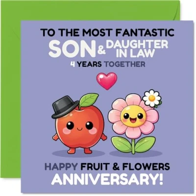 Lifts the mood with a playful cartoon fruit and flower duo, perfect for celebrating a light-hearted anniversary. Anniversary card for Son & Daughter In Law with a light-hearted design style Cheerful, colourful artwork stands out with its vibrant purple, green, pink and red, making it a true keepsake. Recyclable and printed in UK for a considerate choice Printed on quality gloss board with an uncoated inside, so no smudging when writing inside your message. Printed on 360 micron stock for a confident, premium feel Inside message: Son & Daughter In Law. Includes a matching envelope for easy gifting. The 145mm Square format is convenient to display or post Proudly designed and printed in the UK with recyclable materials and FSC certified for extra peace of mind. A thoughtful choice that helps you send smiles and warm wishes