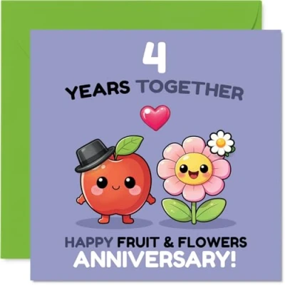 Brimming with playfulness, this card celebrates four years together with a cheerful apple and flower cartoon sharing the spotlight. Anniversary card with a light-hearted design style The vibrant design features cute fruit and floral characters in lively purple. green. pink. red, and yellow. adding a joyful touch to your anniversary Crafted on gloss single sided board with an uncoated inside for effortless writing - no smudging when writing inside. Printed on 360 micron stock for a confident, premium feel so you can pen your own heartfelt or cheeky message. Supplied with a matching envelope for a polished finish. The 145mm Square format is convenient to display or post Designed and printed in the UK using FSC-certified, recyclable - a quality keepsake for anyone marking a fun milestone. Ideal for a husband or wife celebrating a milestone anniversary