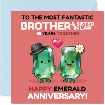 Full of playful charm, this card features two smiling emerald gemstones hand in hand, bringing a sense of fun to a special 55th milestone. Anniversary card for Brother & Sister In Law with a light-hearted design style The quirky gemstone motif is a cheeky nod to the emerald anniversary, popping with vibrant green and pink for a joyful touch. Recyclable and printed in UK for a considerate choice Printed on glossy board with an uncoated inside for easy writing. No smudging when writing inside, so your message stays crisp. Printed on 360 micron stock for a confident, premium feel Inside message: Brother & Sister In Law. Comes with a handy envelope, ready to give on the big day. The 145mm Square format is convenient to display or post Proudly made in the UK using FSC-certified and fully recyclable materials-quality with a conscience, and a grin. Printed in the UK. A thoughtful choice that helps you send smiles and warm wishes