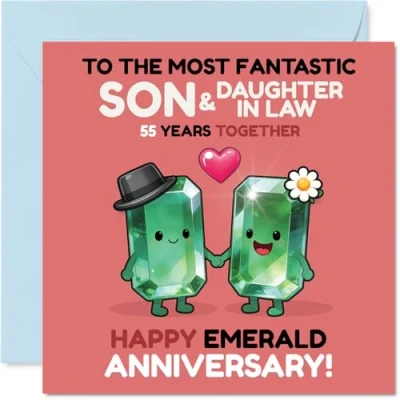 Packed with playful charm, this card features two adorable emerald gemstones holding hands, bringing a smile for such a wonderful milestone. Anniversary card for Son & Daughter In Law with a light-hearted design style Distinctive cartoon motif in cheerful pink and green, making the happy emerald anniversary theme pop for a fun keepsake. Recyclable and printed in UK for a considerate choice Printed on glossy single sided board with an uncoated inside - No smudging when writing inside - made using FSC certified board. Printed on 360 micron stock for a confident, premium feel Inside message: Son & Daughter In Law. Supplied with a matching envelope to make gifting easy and stylish. The 145mm Square format is convenient to display or post Designed and printed in the UK with recyclable materials, so you can send your love with extra peace of mind. A thoughtful choice that helps you send smiles and warm wishes